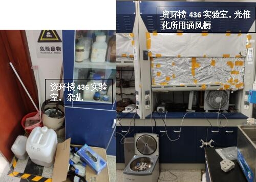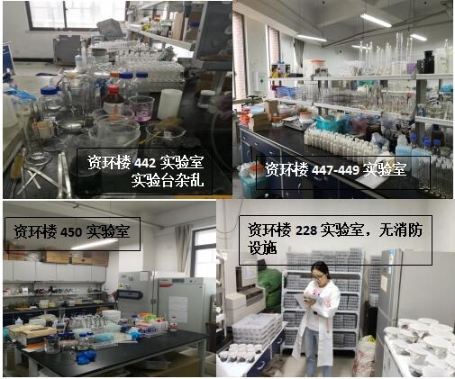 本次检查中几乎所有学生办公室和实验室都存在着大大小小的安全隐患,其中最差学生办公室为生科辅楼一楼113室(甄广印、徐娟、邓杰、蔡永立、韩骥、刘敏学生),最差实验室为生科辅楼112室(甄广印、徐娟、邓杰学生)。检查中发现最普遍的问题是堆放杂物,其他明显的问题有接线板乱拉乱放、做实验穿着不当、办公室使用微波炉等。希望老师和同学们认识到安全问题的严重性,多加重视与防范,发现问题及时改正!