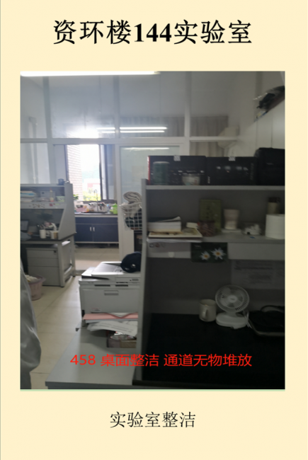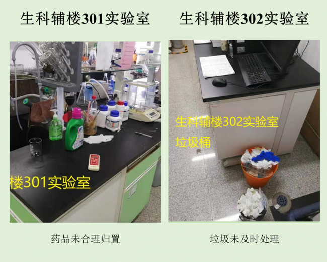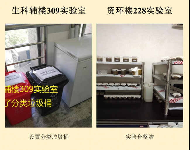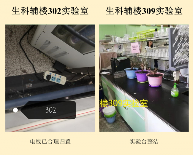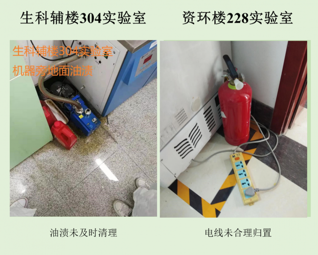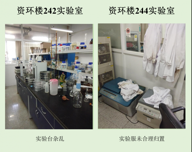 在本次检查的实验室中,资环楼142情况最佳,资环楼446室情况最差。小卫士们总结发现,实验室的评分除了整洁程度影响外,也受实验人员穿着、操作是否规范的影响。老问题如实验试剂,物品随意摆放,电线缠乱,做实验不带手套不穿实验服等有待解决,新问题如实验室带入食物,私拉电线,地面油渍溢出等需要重点关注。另外特地表扬生科辅楼112将值日表,角落堆放钢瓶等问题,生科辅楼302插座串接问题得到整改,生科辅楼309新配备实验垃圾和生活垃圾桶,建议其他实验室效仿,减少垃圾到处丟置现象,生科辅楼309,资环楼228,440,450,458台面清洁整体尚可。