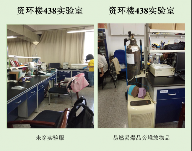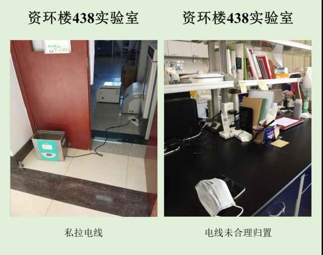 本次检查中几乎所有学生办公室和实验室都存在着大大小小的安全隐患,其中最差学生办公室依然是生科辅楼一楼113室,最差实验室为资环楼446,在此批评。检查中发现最普遍的问题仍旧是堆放杂物,其他明显的问题有接线板乱拉乱放、做实验穿着不当等,极个别实验室带入食物的现象。希望老师和同学们认识到安全问题的严重性,多加重视与防范,发现问题及时改正!