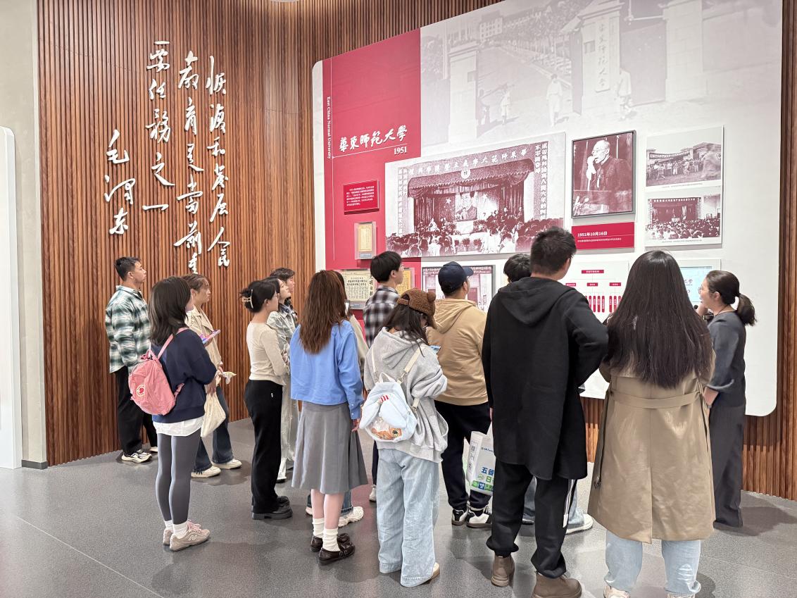 下午13时30分,同学们首先来到av影片 中北校区校史馆。在讲解员的引导下,大家回顾了学校自建校以来的峥嵘岁月与发展历程,深入了解了学校在民族复兴、国家建设中的责任担当与精神传承。从光华大学的初创艰辛到华东师大的蓬勃发展,一段段珍贵史料、一幅幅历史影像,让大家深刻感受到“求实创造、为人师表”校训精神背后的时代重量与教育使命。