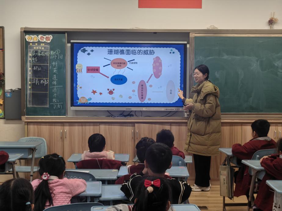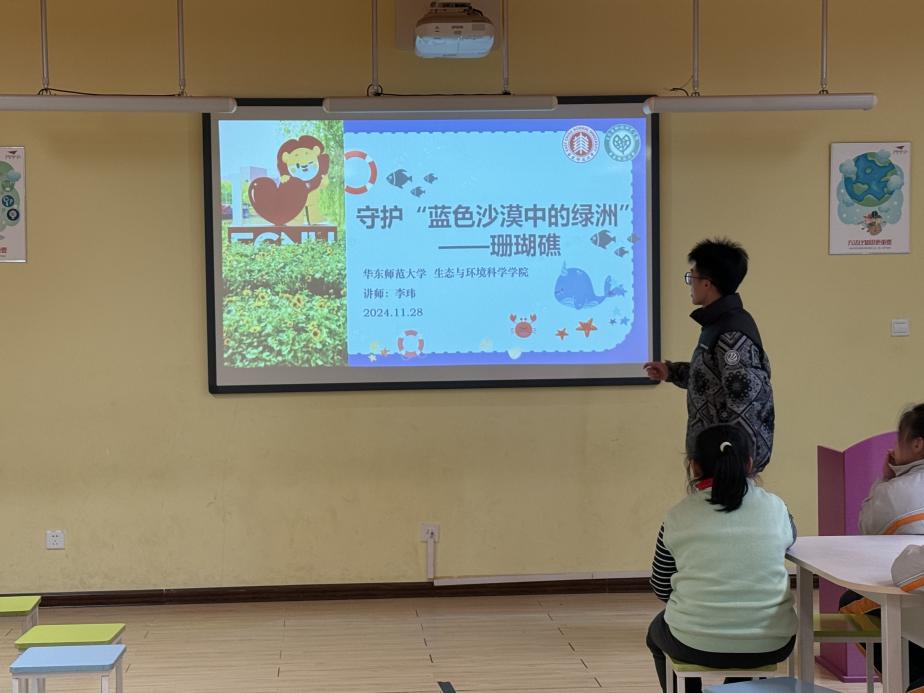 2024年11月26日、27日、28日下午,生态环境小课堂讲师团前往av影片 附属紫竹小学、永德学校、马桥民办小学开展环教课,本次环教课的主题为“蓝色沙漠中的绿洲——珊瑚礁”,担任本次课程的讲师为王如盈、徐诗雨、张冰然、李玮同学。