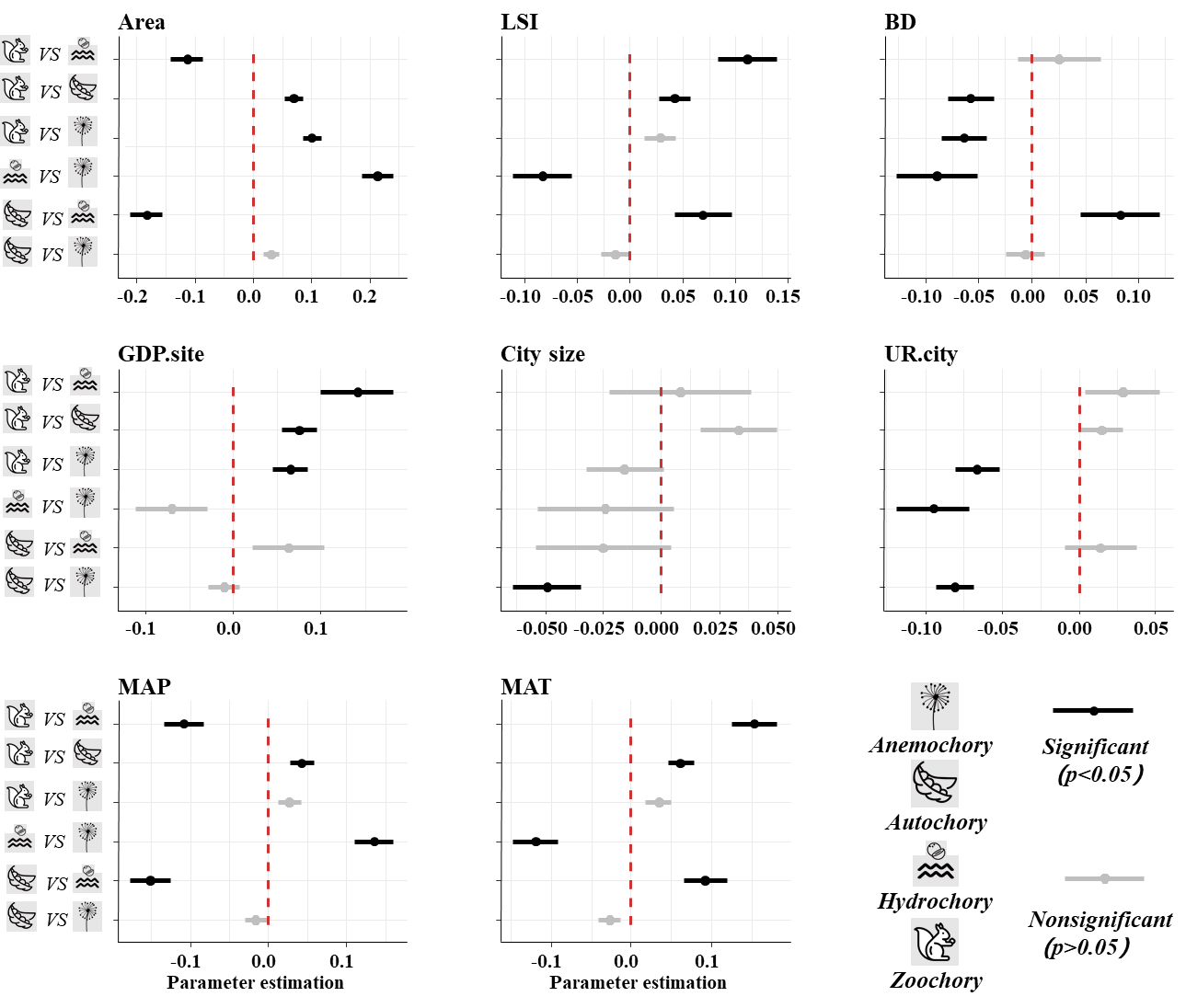 自体传播植物对扩散限制最为敏感,而水传播植物对于生境质量和气候因子较为敏感。