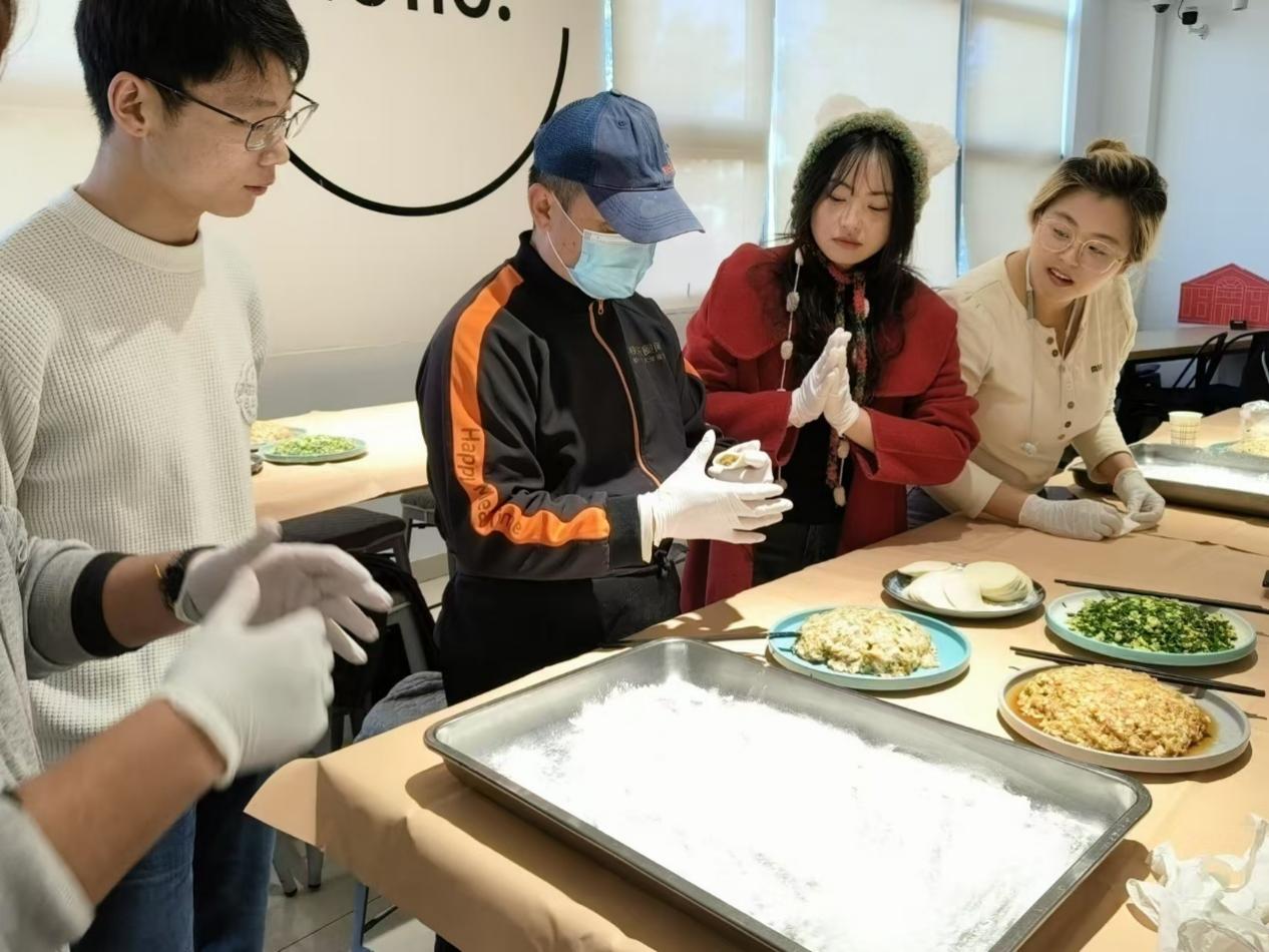 活动伊始,食堂工作人员端上精心准备好的饺子皮和馅料,并现场向同学们教学包饺子的技巧。同学们各自组成小组边学边包,期间与其他同学交流心得,不仅学会了中国传统手艺包饺子,还增进了同学们的友谊。