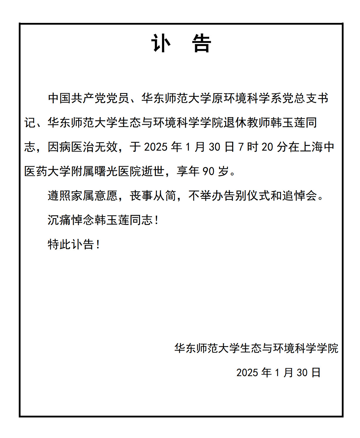 韩玉莲同志讣告