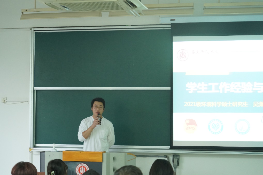 王超同学先向各位研一新生分享了自己心目中学生工作的“初心”与“使命”,向大家逐一介绍自己在学生工作过程中秉持的观念,随后详细地阐述生环研会在学年中举办的各类活动与品牌活动,在展示活动内容的同时,也介绍了自己对举办、参与研会活动的收获和体会。王超同学在谈及个人心得体会时,指出在参与学生工作的同时也需要平衡好学习和生活,达到“学生工作-生活-学习”三者的平衡,并结合自己在研会工作的收获,鼓励大家参与到研会的工作与活动中。