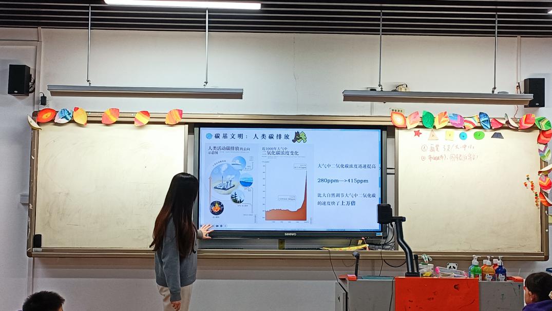最后,讲师们通过中国的植树造林、光伏发电、新能源汽车等解决方案,引导同学们深入思考我们该如何应对碳排放过多的问题。同学们积极探讨自己在生活中能做出哪些力所能及的事,如尽量减少一次性制品的使用、主动进行垃圾分类、循环利用可再生资源等,以自己的一份力,加入到重塑碳循环的行动中。