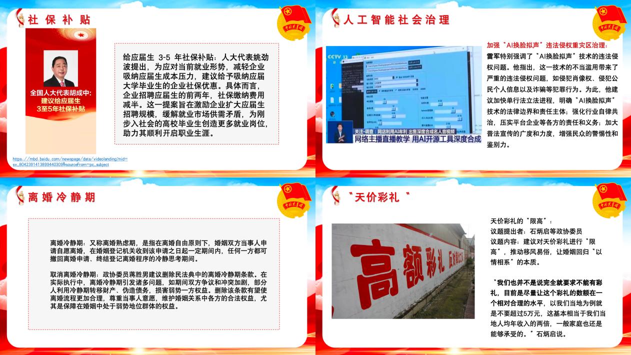 在全国“两会”刚刚闭幕之际,班级团支书薛天宇同学以“两会”为主题,向班级团员详细介绍了两会的时间安排、各会议职能及工作流程,帮助同学们深入理解我国的人民代表大会制度以及中国共产党领导的多党合作和政治协商制度。在热点提案分享环节,薛天宇同学选取“应届生社保补贴”、“离婚冷静期”、“天价彩礼”以及“人工智能社会治理”等备受关注的提案,深入分析其背景与意义,并组织同学们展开讨论与交流,引导大家积极思考。