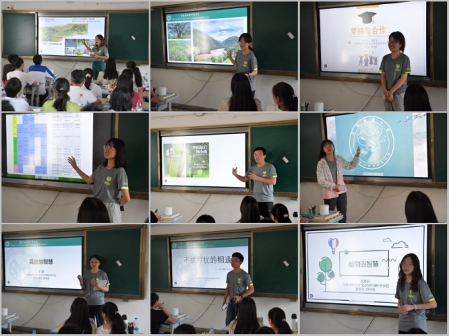 在两个高中班级中,路葵和瞿轶雯老师分别介绍了华师大和生环学院的情况,播放了2021年华师大的招生宣传片《圆的故事》,一段通过手绘漫画讲述不断认识自身、不断拓宽认知边界的故事,鼓励高中生们要不断成为更好的自己,接受更广阔世界的光,看到更大的世界。金泉泉、尹世浩等6位学生分为两组在两个班级开展“走近大学生”板块的分享,他们结合自己的高中和大学学习体会分享曾经的困惑和“豁然开朗”的心得。汪艺洁、林彤等8位同学分为两组在两个班级开展“生环小课堂”板块的分享,他们结合两周以来实践课程中的收获分享了自然的魅力、动植物的奇妙“智慧”、野外调查研究中无人机和红外相机等技术的有趣运用等,带领高中生体验一段“探索自然之旅”。张健和斯幸峰老师分别在两个班级带领同学们领略了“自然是最好的学校”和“无限风光在险峰”,两位老师丰富的求学经历、精彩的实践探索、有趣的科研故事引得同学们掌声连连,短短几分钟就“吸粉”无数。