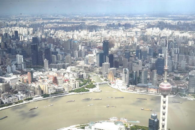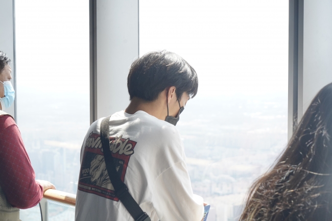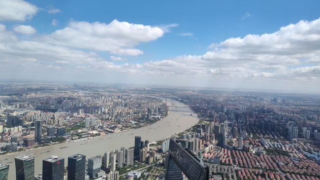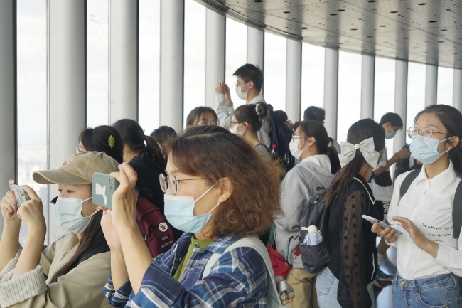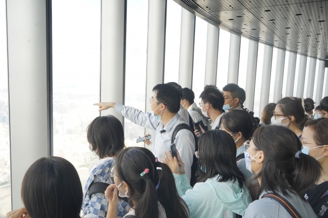 9点40分,同学们乘坐世界上速度最快的电梯,仅耗时55s到达118层,一下电梯,十里洋场、黄埔江、陆家嘴、熙熙攘攘的大上海尽收眼底。