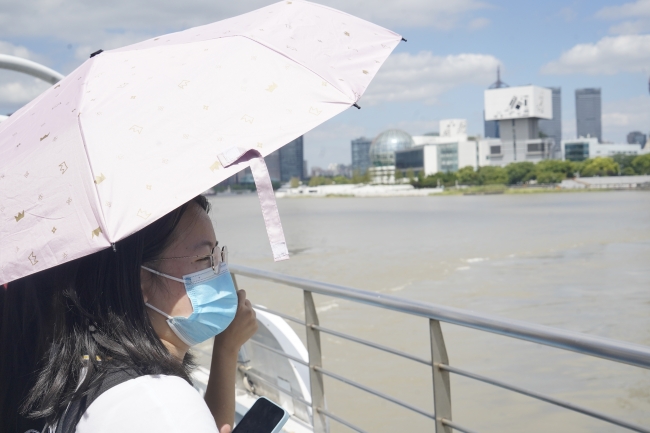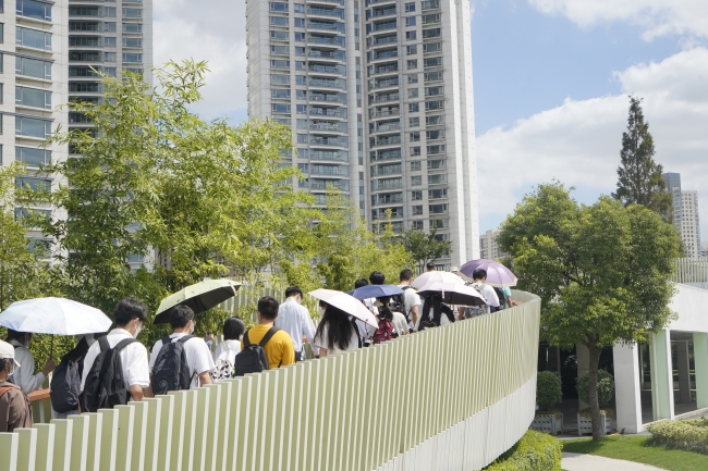 10点40分,上海中心的参观结束,步履不停,实习师生一行马上开启了3公里的浦东滨江大道的徒步之旅。途中,老师和助教给同学们讲解了潮水倒灌对策、河道污染防治措施等知识。