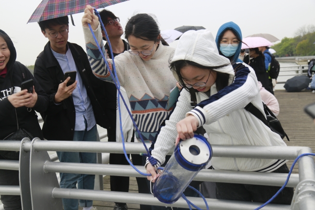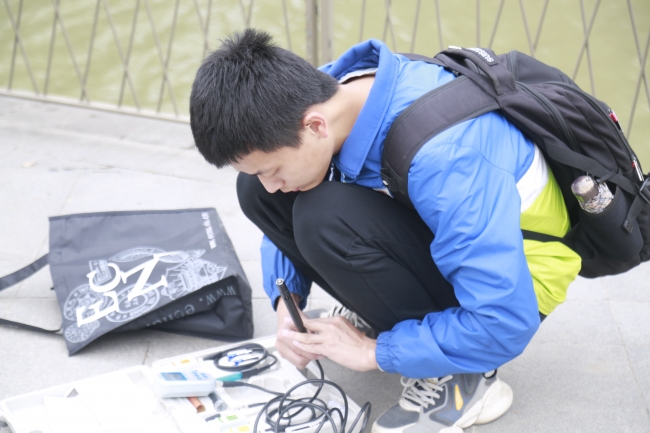 讲解结束后,大家对黄浦江此段的水质进行了测量。