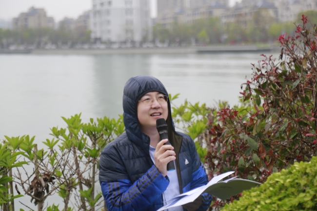 细雨中,张勇老师讲解兰香湖背后的“绿水青山就是金山银山”