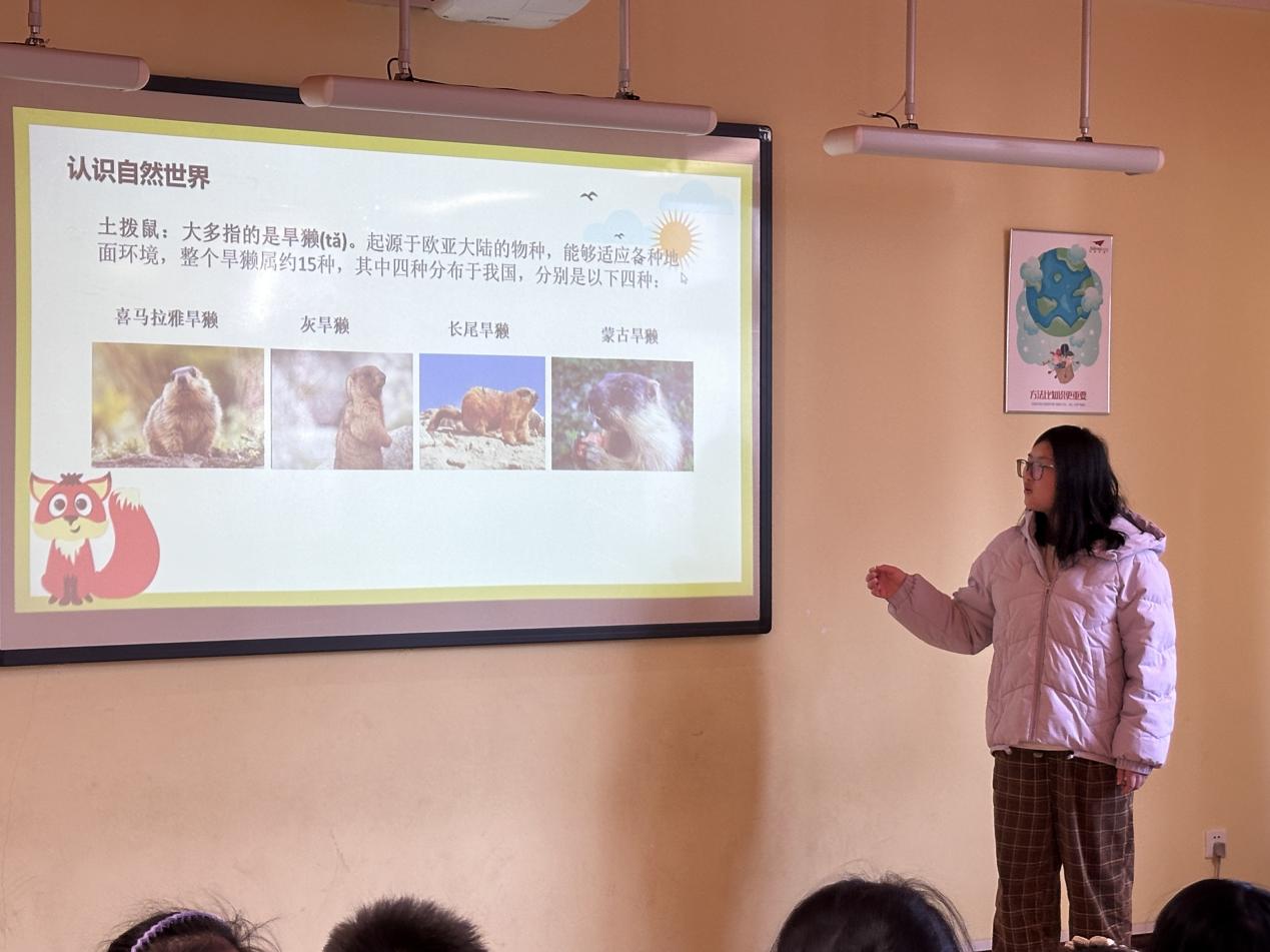 在正式上课之前,讲师们先给同学们看了一部纪录片《荒野之上》,里面记录了大自然中各种各样的动物。随后,借助春季档的电影《哪吒2:魔童闹海》中的爆火出圈小动物土拨鼠,自然地引出了本节课的第一个动物——土拨鼠,也就是旱獭。讲师们为同学们讲解了在我国分布的四种旱獭种类以及他们的两个重要的习性——擅长“打洞”、发现天敌时尖叫报信。