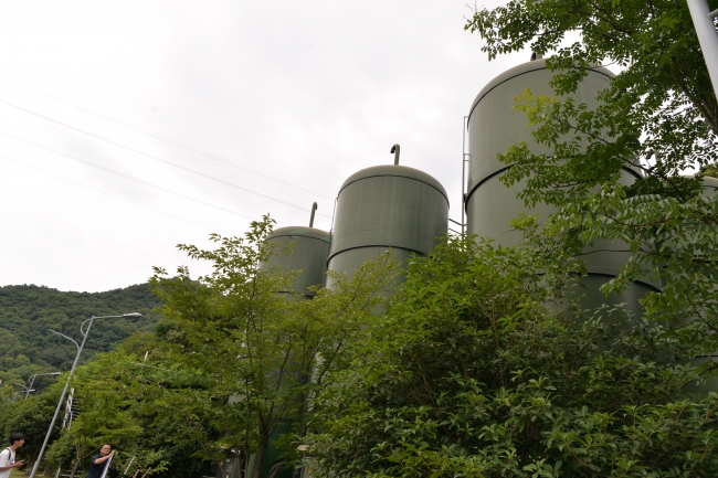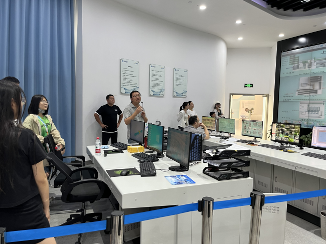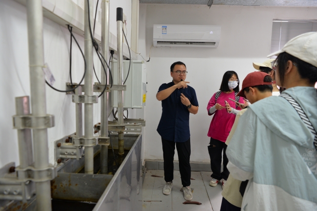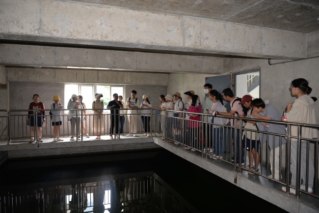 下午,师生们乘车到达玉皇山引水预处理场,考察西湖引配水与降氮工程。紧跟水厂管理负责人潘老师的脚步,同学们实地学习了水处理工艺混合、絮凝、沉淀的三个环节,直观地感受到浑浊的原水逐渐变为清澈的过程。再进入到降氮工程构筑物内部,进一步了解轻质载体单极反硝化滤池降氮工艺的原理,深入理解引水降氮工程在西湖水质全面提升过程中的重要作用。