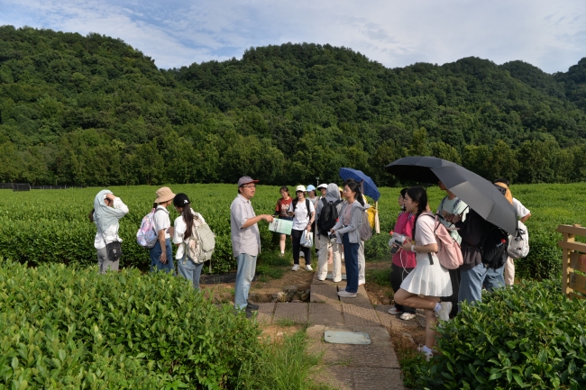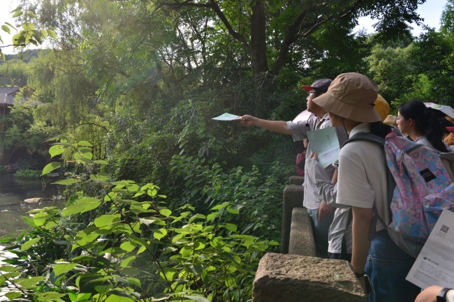 然而茶产业背后的生态环境问题也不容忽视。在茶博门口的茶园现场,陈雪初老师介绍了茶叶种植面源污染及周边餐饮废水的排放,曾一度导致龙泓涧生态环境恶化。龙泓涧水生态修复工程解决了面源污染问题,其最大特点便是“因势利导”,利用生态修复技术对自然水体进行净化和改善,采取基于自然的解决方法而非大规模工程施工让古老的茶园重焕生机。