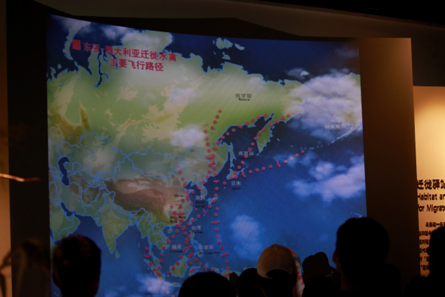 同学们观看东亚——澳大利亚迁徙水禽飞行路径