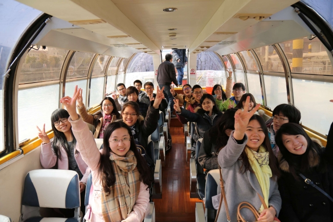 午餐后,各组师生从丹巴路码头乘坐苏州河游船前往苏州河昌化路码头。大家在游船上欣赏了苏州河沿岸的自然景观、人工景观以及一些被保留下来的近代工业旧址,同时也近距离地观察了苏州河目前的水质状况和生态状况。上岸后,大家步行至苏州河梦清园水环境治理展示中心进行参观。