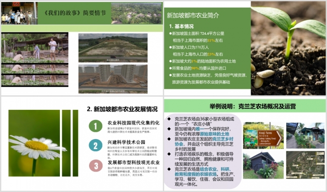 在《新加坡都市农业带来的启示——从电影<我们的故事>谈起》中,欧阳澳老师分享了新加坡电影《我们的故事》中讲述上个世纪七十年代新加坡本地家庭的故事,通过小家庭的酸甜苦辣生活展现国家发展的变迁。新加坡是多种族、多元化的社会,拥有70%以上的人口是华人,其余是马来人、印度人等,是除中国以外的华人最多的国家。随着国家的发展,乡村拆迁,影片中主角们最终全部搬到了政府组屋。新加坡国土面积小,只有上海市的11%左右,农业用地仅占国土面积的1%。由于具备良好的气候条件、优越的旅游资源作为基础,新加坡根据自身情况,大力发展高科技、高产值的都市农业。同时,发展都市型科技观光农业,将农业和旅游有机结合的典型范例就是克兰芝乡村农场。克兰芝农场是结合农业、科研、教育和度假的农娱农场,把生产、学习、餐饮、住宿、会议和田园观光一体化。都市农业的发展将是乡村振兴的风向标,其发展模式、集成科技、人才队伍、供销模式、智能化服务等将成为乡村振兴战略实施的重要参考,也是乡村振兴战略实施的排头兵。新加坡多业态的农场模式,整体规划,资源整合,将新兴技术应用到农业发展中,使得观光农业、生态农业、休闲农业成为城市居民生活的一部分的模式,对推动我国的乡村振兴具有一定的借鉴意义。