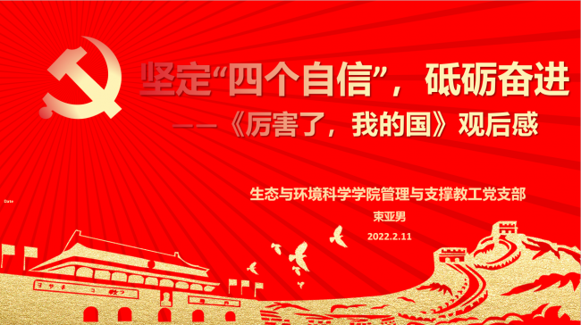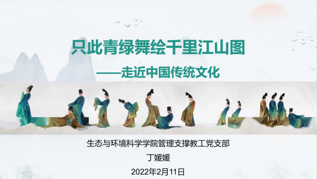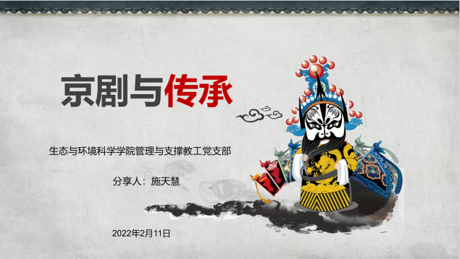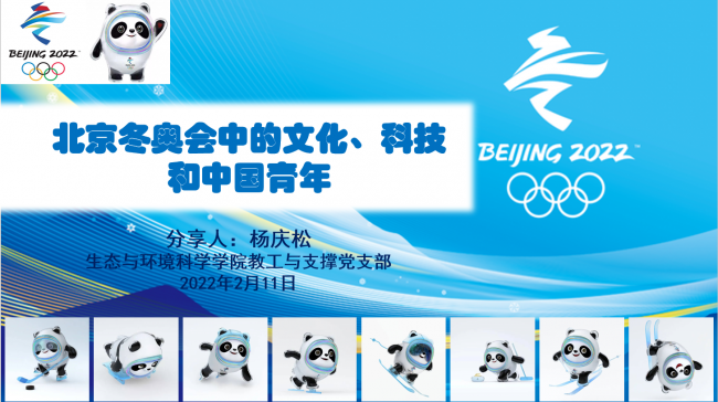 2022年2月11日下午,生环学院管理与支撑教工党支部举办第二场寒假学习分享主题活动,分享人是欧阳澳、丁媛媛、束亚男、杨庆松老师和施天慧同学。欧阳澳老师分享的主题是《新加坡都市农业带来的启示——从电影<我们的故事>谈起》、丁媛媛老师分享的主题是《只此青绿舞绘就千里江山图——走近中国传统文化》、束亚男老师分享的主题是《坚定四个自信,砥砺奋进——<厉害了,我的国>观后感》、杨庆松老师分享的主题是《北京冬奥会中的文化、科技和中国青年》、施天慧同学分享的主题是《京剧与传承》。