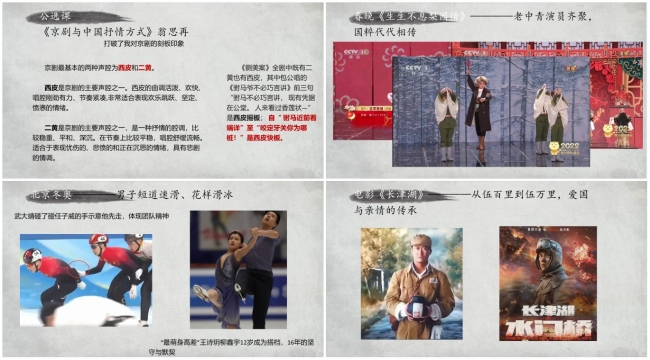 在《京剧与传承》中,施天慧同学从一则“老爷子唱戏腔教小女孩”的短视频谈起,通过讲述康万生老先生传承京剧的认真态度引出主题“京剧与传承”。结合京剧名段《铡美案》中的故事,施天慧同学讲述了自己本科期间选修《京剧与中国抒情方式》公选课的经历,介绍了京剧的基本声腔“西皮”和“二黄”,以及文戏和武戏等表演形式。从武戏《三岔口》片段中体现的团队精神与默契配合,联想到北京冬奥会短道速滑的任子威与武大靖、花样滑冰的王诗玥与柳鑫宇。此外,施天慧同学借助虎年春晚《生生不息梨园情》节目,展示了老中青戏曲演员的曲艺传承,也讲述了近期热播的电影《长津湖》中伍万里弟兄间爱国情怀的传承与骨肉亲情的传递。