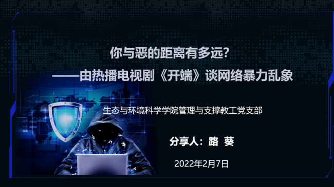 2022年2月7日下午,支部举办第一场寒假学习分享主题活动,分享人是路葵和施卉晰老师。路葵老师分享了两个主题,分别是《精准到平米的上海防疫——从一家奶茶店说起》、《你与恶的距离有多远——由热播剧<开端>谈网络暴力乱象》;施卉晰老师分享的主题是《情与桥——观<长津湖水门桥>有感》。