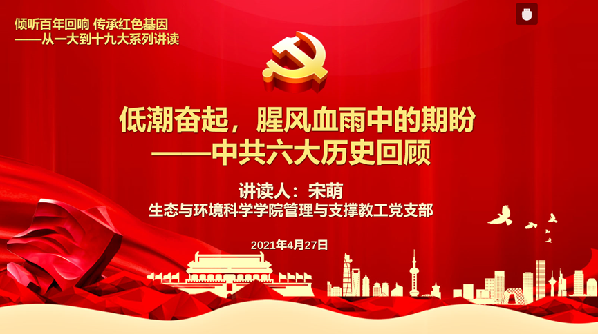 倾听百年回响,传承红色基因,中共一大到十九大系列微党课之“中共五大和中共六大历史回顾”于4月27日上午10:00,在闵行校区第四教学楼326室开讲,本期讲读人为av影片 管理与支撑教工党支部张琪和宋萌,支部全体党员和十余名学生党员参加,共同回顾中国共产党在幼年时期的艰辛探索与发展历程,学习党史,不忘初心。该系列活动结合“百年跨越对话红色经典”校园主题活动日暨经典阅读季开展,微党课讲读结合《从一大到十九大:中国共产党全国代表大会史1921-2017》等书籍开展。