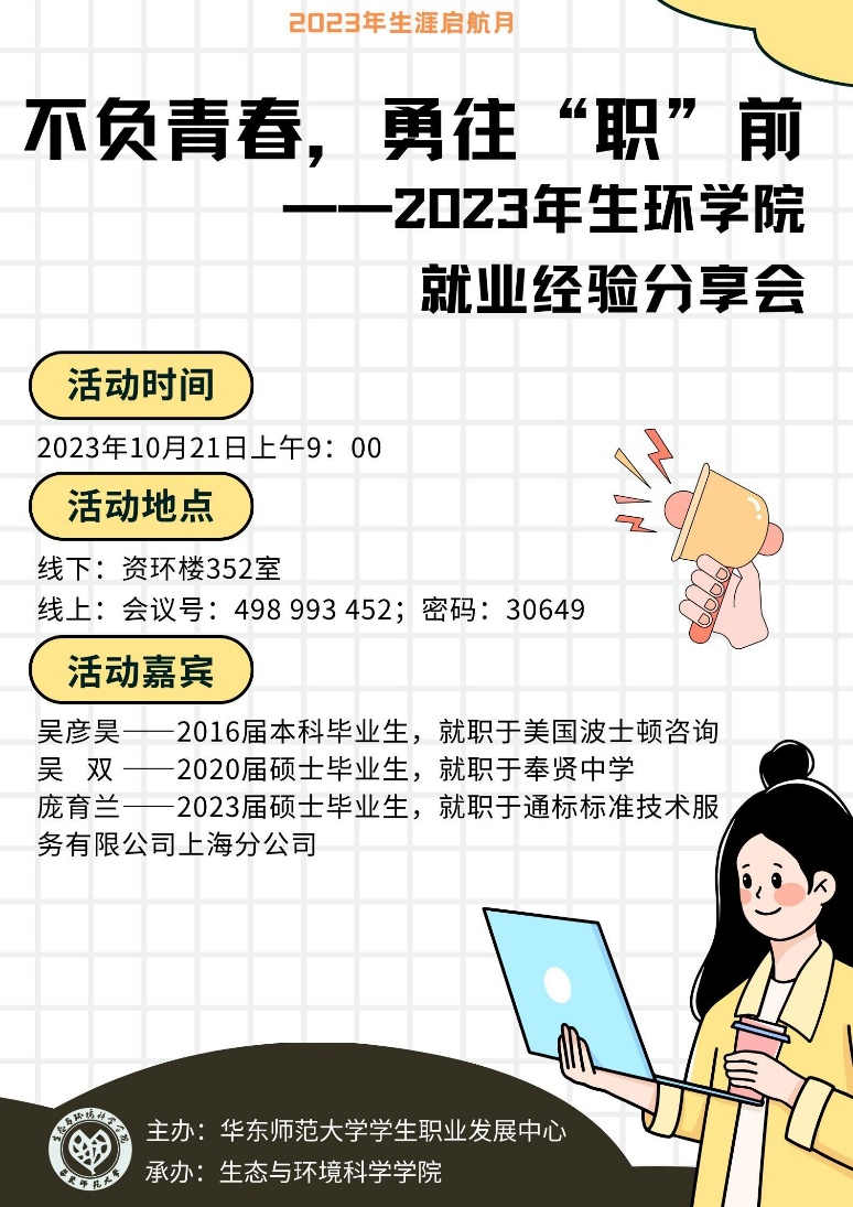 2023年10月21日上午9:00,av影片 通过线上线下相结合的方式举办“不负青春 勇往“职”前”就业经验分享会,线上通过腾讯会议平台,线下在资环楼354室开展。本次活动邀请了吴彦昊、吴双和庞育兰三位校友,他们结合自身求职和工作经验,从不同角度开展经验分享。本次活动是由校学生职业发展中心主办,学院承办的2023年“生涯启航月”系列活动之一,活动吸引了线上线下共计70余名同学参加,学院专职辅导员吴丹担任主持。