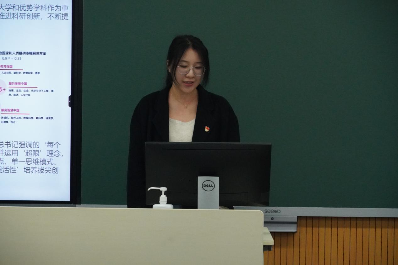 生态支部的第二党小组成员方程柳慧以“如何理解育人创新”为题进行了分享。育人创新旨在培养创新型人才,创新型人才作为国家科技创新的源动力,不仅能推动科技领域的突破,而且可以提高国家竞争力。作为研究生,我们应该积极参与创新竞赛,定期进行学术交流,培养全面素质和创新能力,提升为人民服务的能力。随后,小组的另外两位成员李嘉琪和李慧珠上台分享学习感悟,两位同学表示培养创新能力应该关注自身全面素质的发展,保持开放和包容的思维,提高实践能力和团队协作能力,做到全面发展。