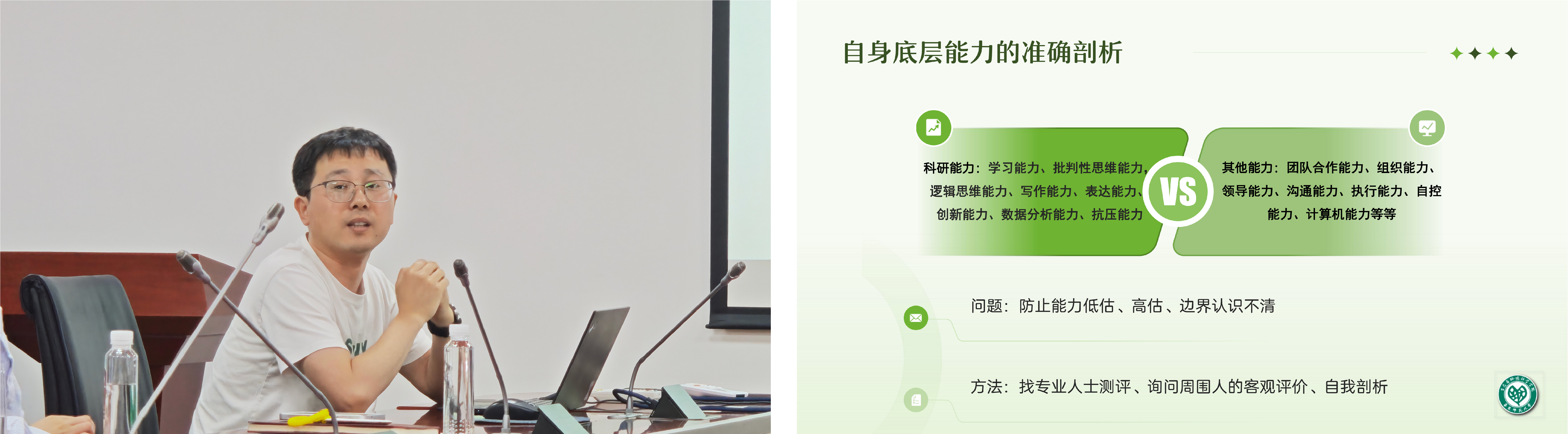 刘何铭博士现任上海辰山植物园青年研究组长,他从自身底层能力剖析、就业途径和就业动力三个层面出发,建议博士生要客观评估自身优势,并详细分析了基于能力、专业和研究方向三种不同就业途径的岗位要求及可选择的单位类型,为在场学生提供了切实可行的就业指导。