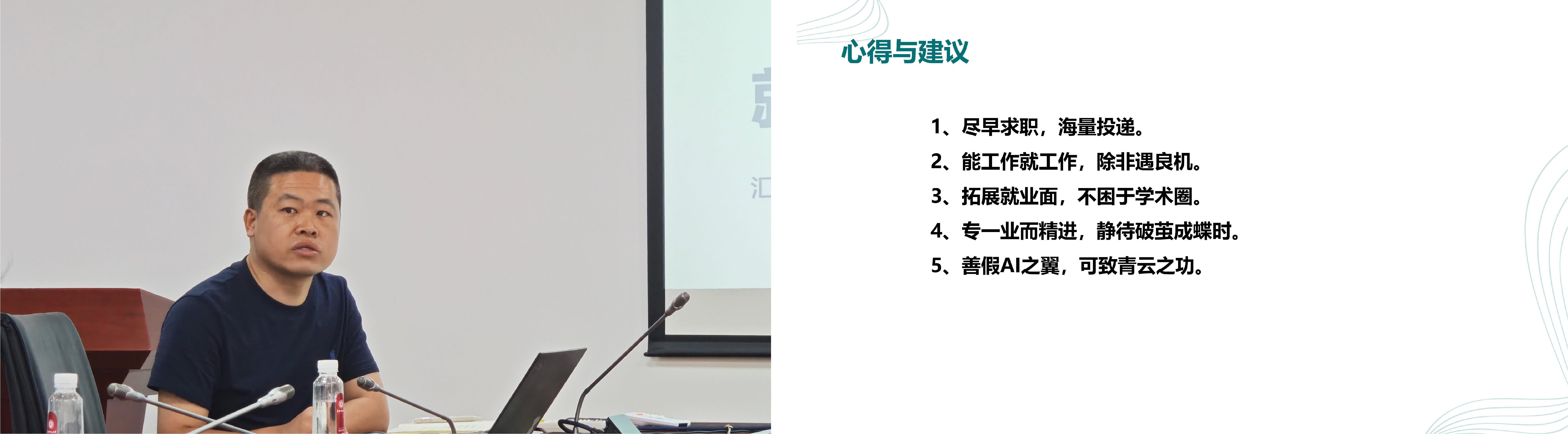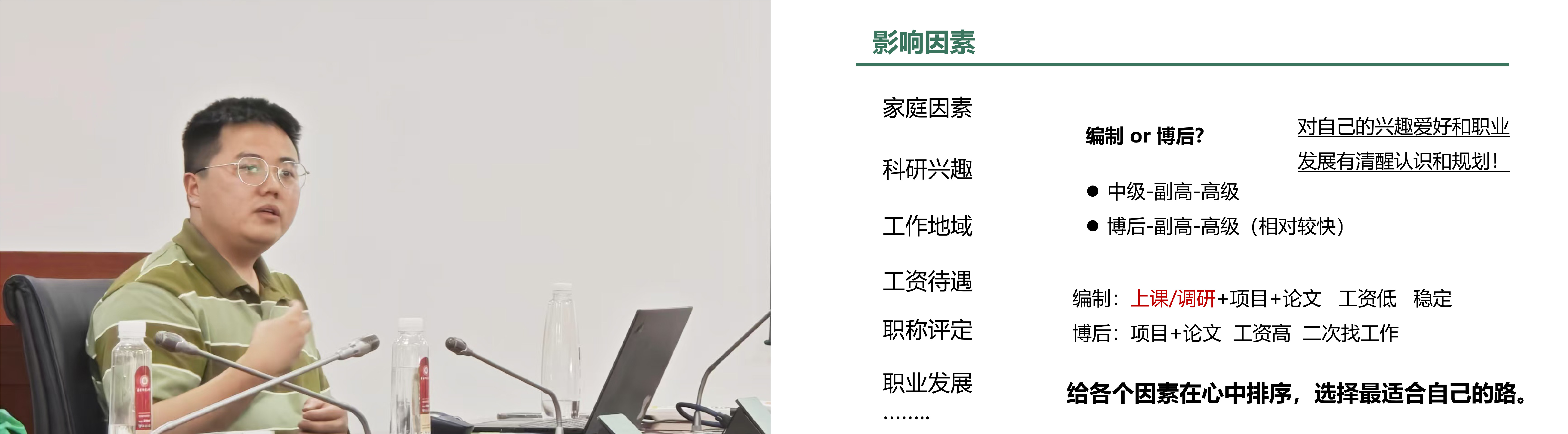 蒋铮博士现任上海市农业科学院助理研究员,他围绕就业选择、影响因素和求职建议三个方面进行分享。他建议同学们:一要发掘自身闪光点,放眼科研和非科研单位的多向选择,找寻适合自己的生态位;二要综合考虑科研兴趣、地域偏好、家庭因素和职业发展等核心要素,建立科学的求职优先级;三要提前调研目标单位的人才引进政策,关注不同岗位的能力需求差异和职业发展潜力,做好充分的就业准备。