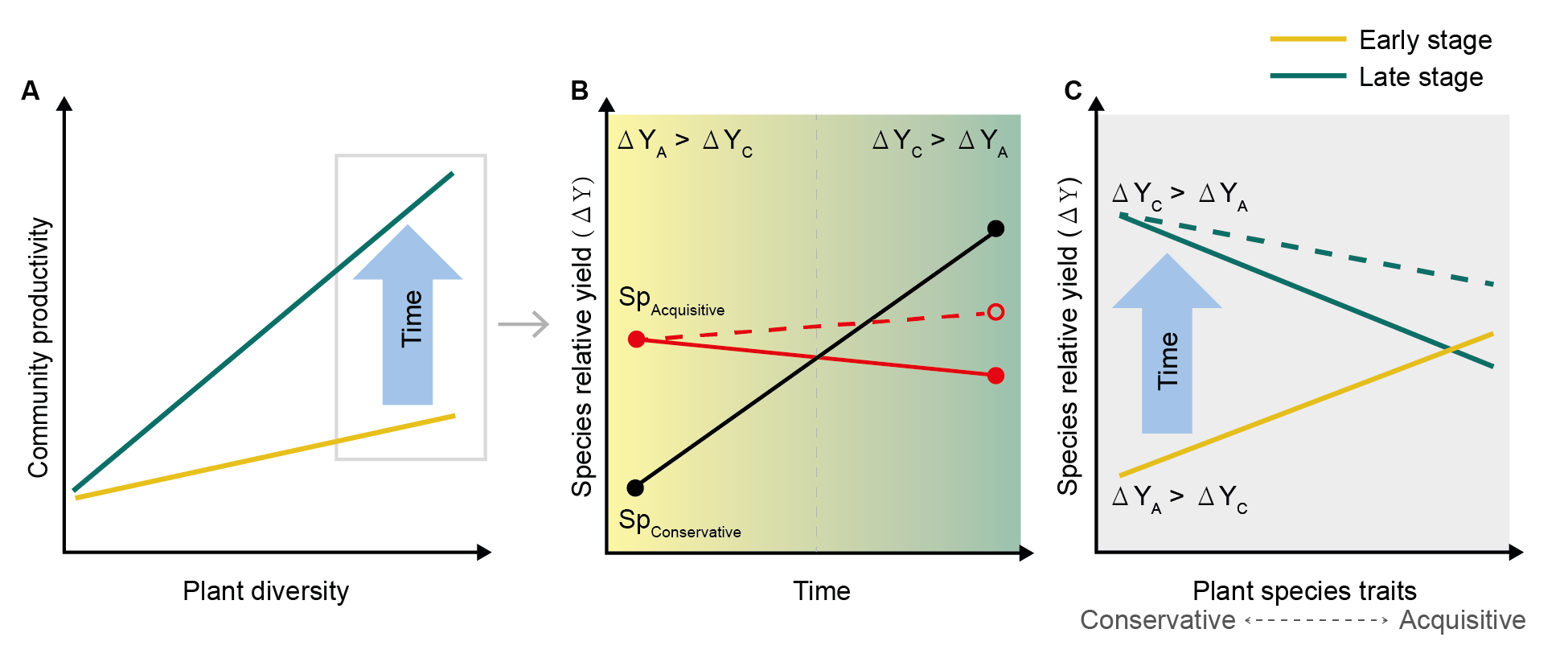 图2. 群落水平的植物多样性效应的时间强化取决于物种水平生长超产随时间的推移概念模型