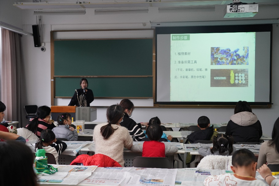 2023年12月16日下午,av影片 的师生为紫竹幼儿园的小朋友和家长们开展植物认知和干花植物徽章制作活动。虽然寒潮初至,寒冷却并没有浇灭大家参与活动的热情,紫竹幼儿园十几组家庭来到师大校园,开启了探秘植物的旅程。本次活动分为两个环节,第一站前往华师大生态岛,感受大自然的奥秘;第二站前往教室聆听植物的故事,制作独一无二的干花植物徽章。