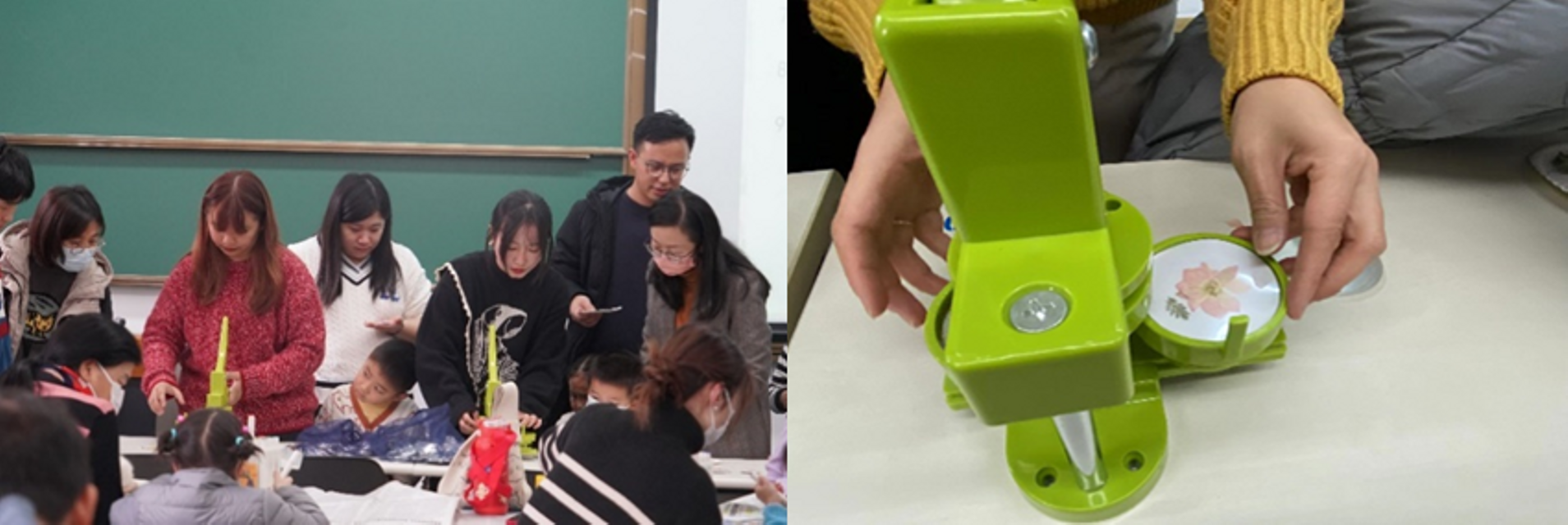 随后,22级生态学专业硕士研究生周心旎将制作干花植物徽章的流程一一展示。首先,用镊子轻轻夹起精美的干花和叶子,用固体胶固定在直径5.8厘米的圆形纸片上,再搭配出自己心仪的图案,并用彩笔画出自己的创意,最后再放入徽章机上,覆上一层薄膜,定好位置用力按压,一个个漂亮可爱的徽章就制作完成啦。小朋友们跃跃欲试,在家长和老师们的帮助下,脑洞大开,创意无限,每个人都制作出了专属自己的植物徽章。
