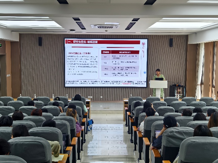 随后,研究生教务束亚男老师为在场师生深入解读了我校学硕转博、专硕转博的新政策与流程。她系统梳理了读博流程、政策要点、招生简章、报名时间节点、奖学金设置以及研究方向等关键信息。束老师着重强调,学院为不同阶段的学生设置有不同的奖励政策,同时,学院全力支持并鼓励学生参与高水平科研活动,旨在激励同学们积极进取和全方位助力学生明确学术规划,为同学们的科研之路保驾护航。