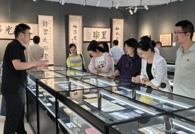 之后,支部党员前往图书馆参观“一生有光:光华大学建校百年纪念文物文献展”,共同学习光华大学在现代中国教育史上波澜壮阔的发展历程。“学人翰墨”板块中诸多大夏先贤的手泽真迹,“文献集珍”板块中毕业证书、期刊杂志和合影照片蕴含了光华大学发展的历史细节,“大夏光华”板块展示了大夏大学、光华大学两所学校教授或校董的书作及相关文献。大家认真聆听志愿者对展品背后故事的讲述,时而驻足凝视书画手稿,时而俯身细观陈列的照片原件。