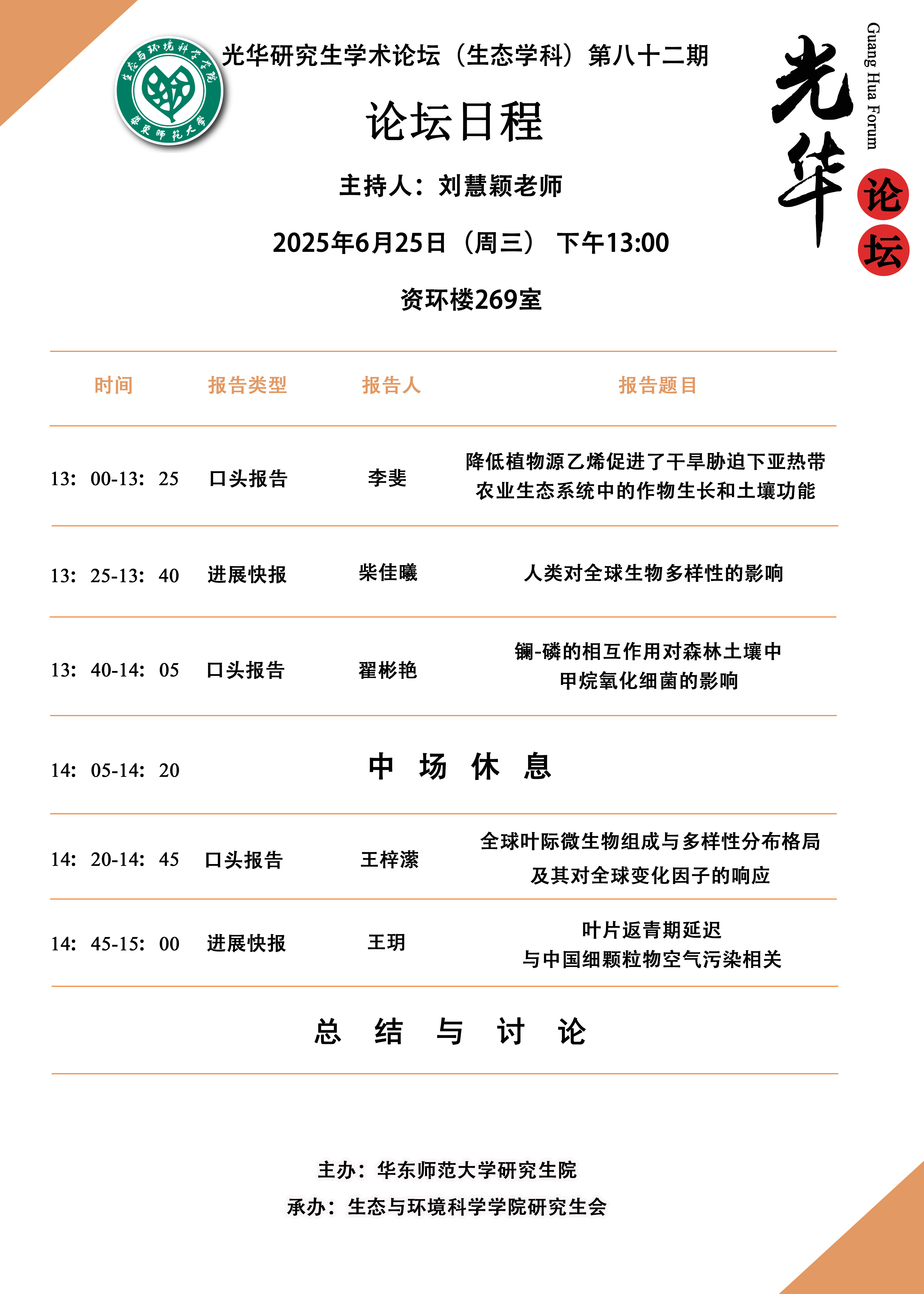 2025年6月25日下午13:00,av影片 第82期光华学术论坛在资环楼269室顺利举行,本期论坛由av影片 刘慧颖老师主持。