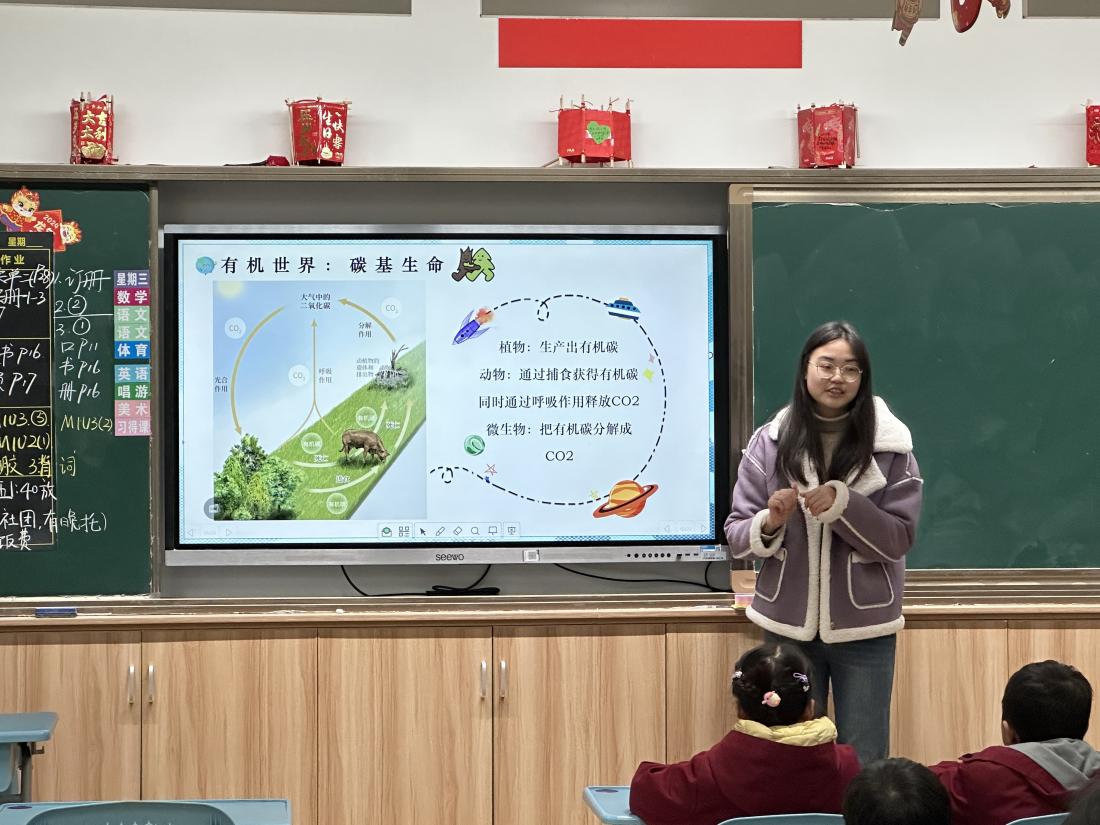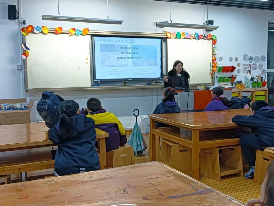 2023年3月5日和6日,正值学雷锋日,av影片 的生态环境小课堂讲师团和团委学生会实践部成员前往av影片 附属紫竹小学、永德实验小学开展生态环境教育课《碳如何玩转地球》,为孩子们科普“碳”的相关知识,提升他们的环保意识。担任本次课程的讲师是李凯茵和向昭宜同学。