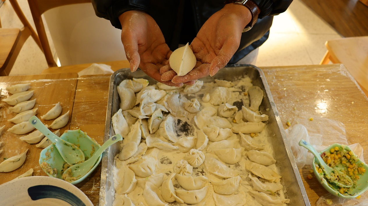 第一项活动为包饺子技巧学习,辅导员吴丹给同学们演示了擀皮、包饺子的技巧经验,给同学们提供了良好的示范。