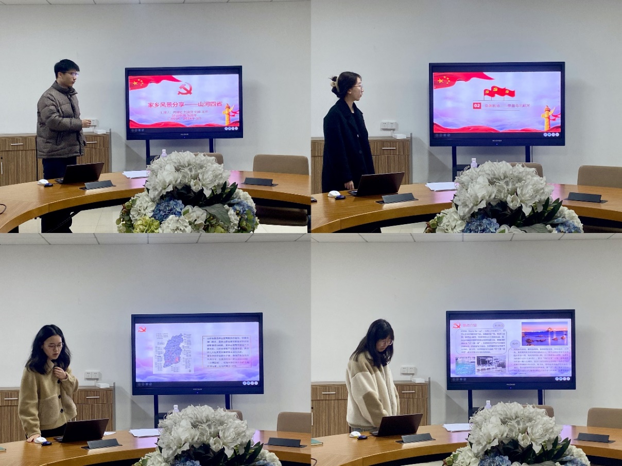 近期,全国各地的文旅产业纷纷上分,崭露头角,展现出了浓厚的地域特色和文化魅力。为了增进我们对家乡的了解和热爱,激发对家乡文旅产业的关注与支持,同时促进党员之间的交流与合作,2024年3月18日下午,生环学院2022级环境学硕士研究生第一党支部在资环楼271室内召开组织生活,活动主题为“我为家乡代言——家乡文旅风采展示”。本次活动由支部书记周耀主持,不同地域的同学组成一个小组进行家乡的介绍与分享,支部指导老师张琪参与此次活动。