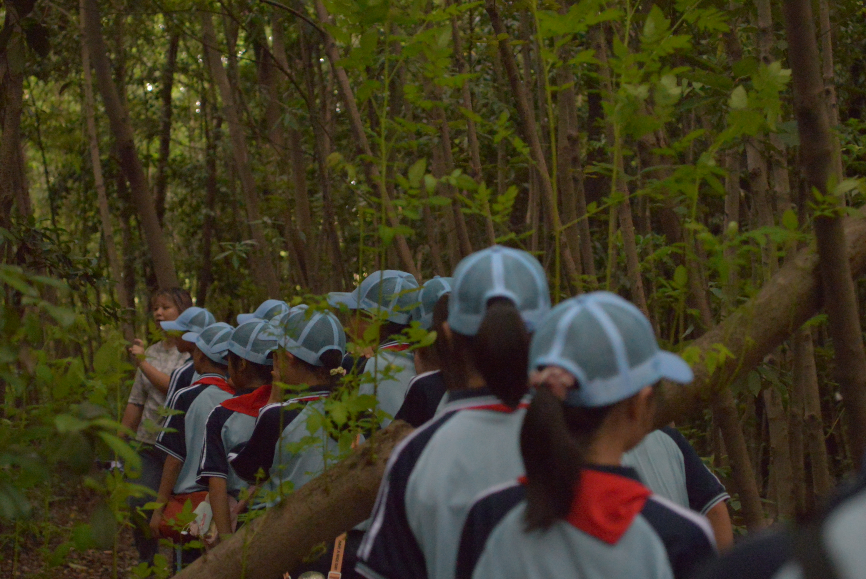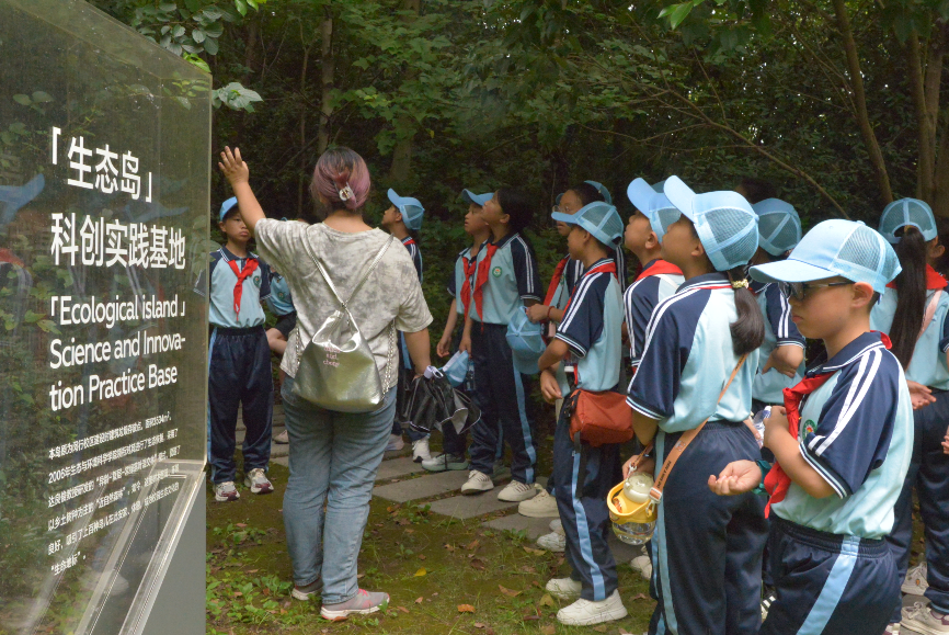 紧接着,同学们移步到了绿意盎然的生态岛。生态学博士研究生罗心怡为大家介绍了生态岛的历史:这里原为建筑垃圾堆场,后由av影片 研究团队经过精心设计与生态修复而成,占地面积3534平方米。岛上采用“异龄-复层-常绿落叶混交林”模式,种植了青冈、青栲、红楠、枫香等上海乡土树种,形成了丰富多样的生态系统。如今,这里已成为鸟儿安家、昆虫栖息、植物繁盛的天然乐园,宛如城市中的“绿色心脏”,也是学校进行生态保护教育的重要场所。