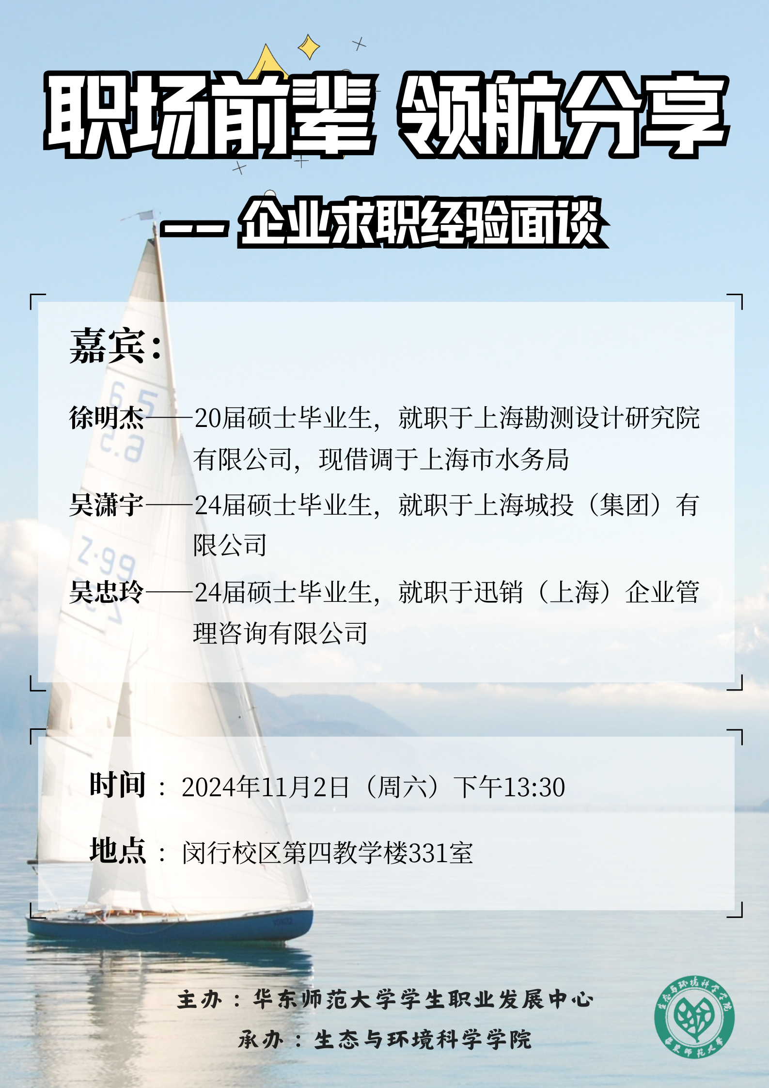 为助力同学们了解职场动态,掌握有效的求职策略,提升个人就业竞争力,为未来的职业生涯奠定坚实基础,av影片 于2024年11月2日在闵行校区四教331教室举办“职场前辈,领航分享——企业求职经验面面谈”就业分享活动。活动邀请20届生态学系硕士毕业生徐明杰、24届环境学系硕士毕业生吴潇宇和吴忠玲重回母校,和同学们分享他们的求职经验和工作感悟。专职辅导员吴丹和60余位学生参与本次活动,活动由研会生涯部负责人王九洲主持。