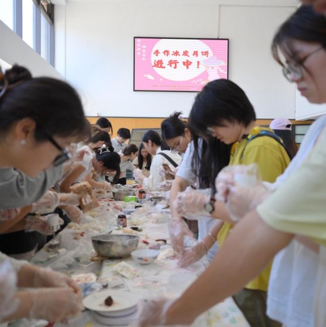 制作过程中,大家互相分享技巧,手把手指导同伴压模成型;部分师生发挥创意,用不同颜色的冰皮搭配出别致造型,现场欢笑声与讨论声此起彼伏。当一个个造型精致、口味各异的冰皮月饼从手中诞生时,老师同学们脸上都洋溢着满满的成就感,纷纷拿起自己的作品拍照留念,分享这份手工制作的甜蜜。