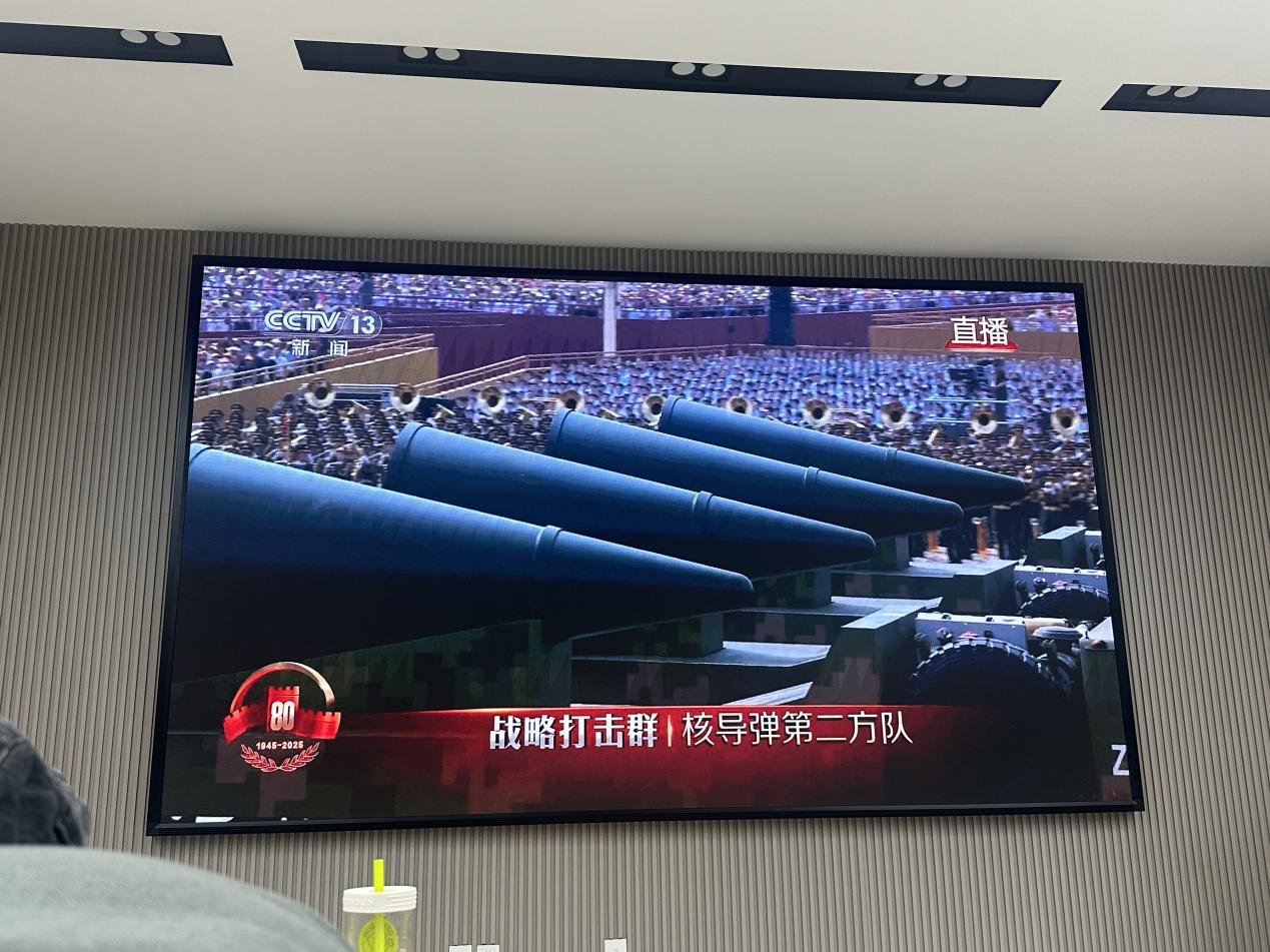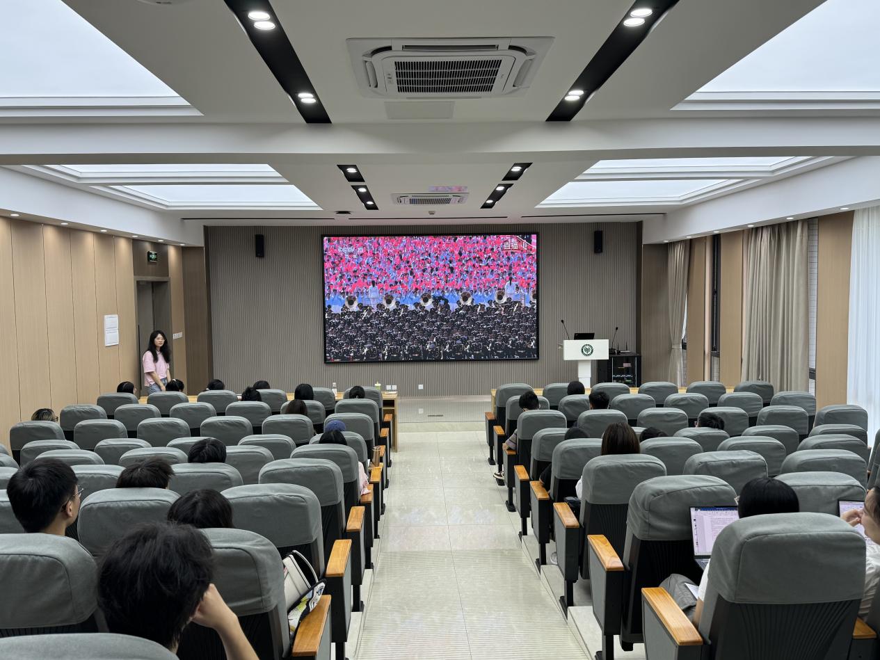 阅兵仪式在庄严的国歌声中拉开帷幕,当雄壮的《义勇军进行曲》响彻天安门广场,也回荡在资环楼报告厅的每一个角落。这一刻,报告厅内洋溢着无比庄重而热烈的氛围,每个人的眼中都闪烁着自豪与激动的光芒,强烈的民族自豪感和爱国情怀在心中澎湃激荡。