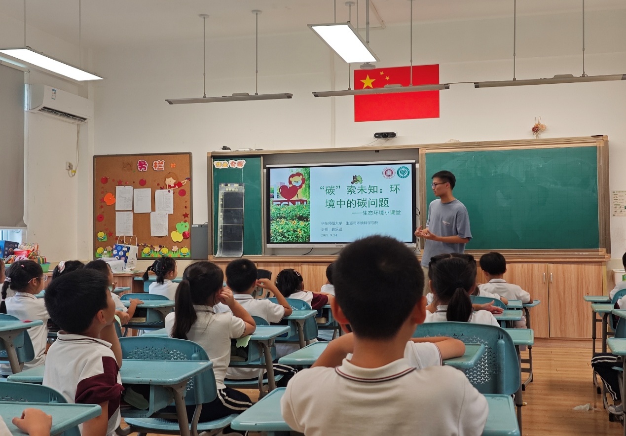 2025年9月23、24日,生环小课堂讲师团前往av影片 附属紫竹小学、永德学校开展环教课,主题为“‘碳’索未知:环境中的碳问题”,狄乐遥、冯运佳、苏雅日哈乐同学担任本次课程的讲师。